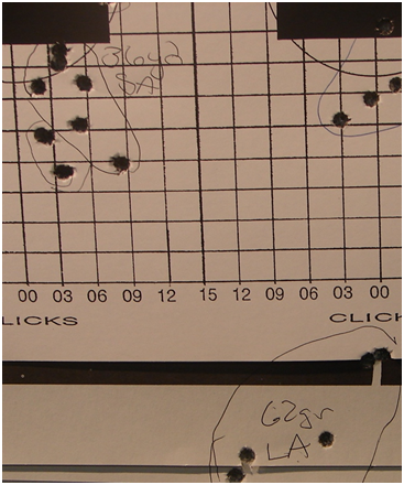 Top group was shot at 36 yards with M855 5.56mm NATO ammo with the Small (long range) Aperture and the bottom group was shot with the same ammo and rifle at 50 yards with the Large (0-200 short range) Aperture.