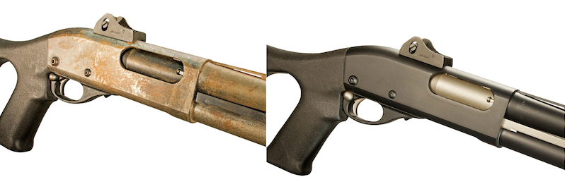 Before / After picture of a Remington 870 with Roguard externals & NP3® internals