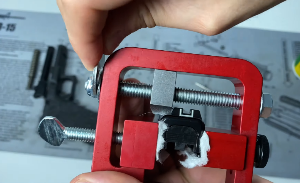 Two of the sides are left open to let you see the work in progress. You can fix the position of the gun from either side of the tool. For long-lasting results, consider using anodized aluminum. The tool works with all types of handguns and provides excellent help for semi-auto pistols. Ensure you clamp it to the surface before use for safety and sturdiness.